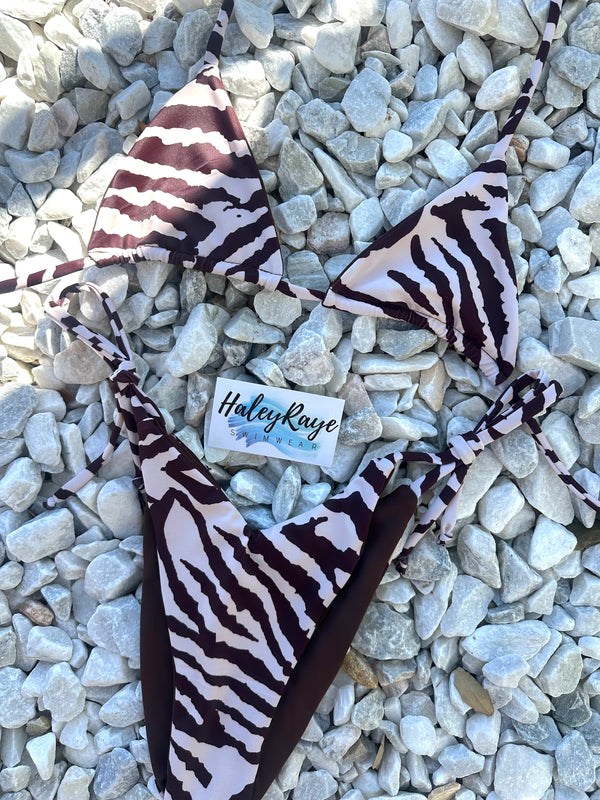 Meet your new favorite bikini: Mojave Reversible to Brown The Mojave print is a Cream and Brown print. Pictured: The Salty Bottom with thin straps
